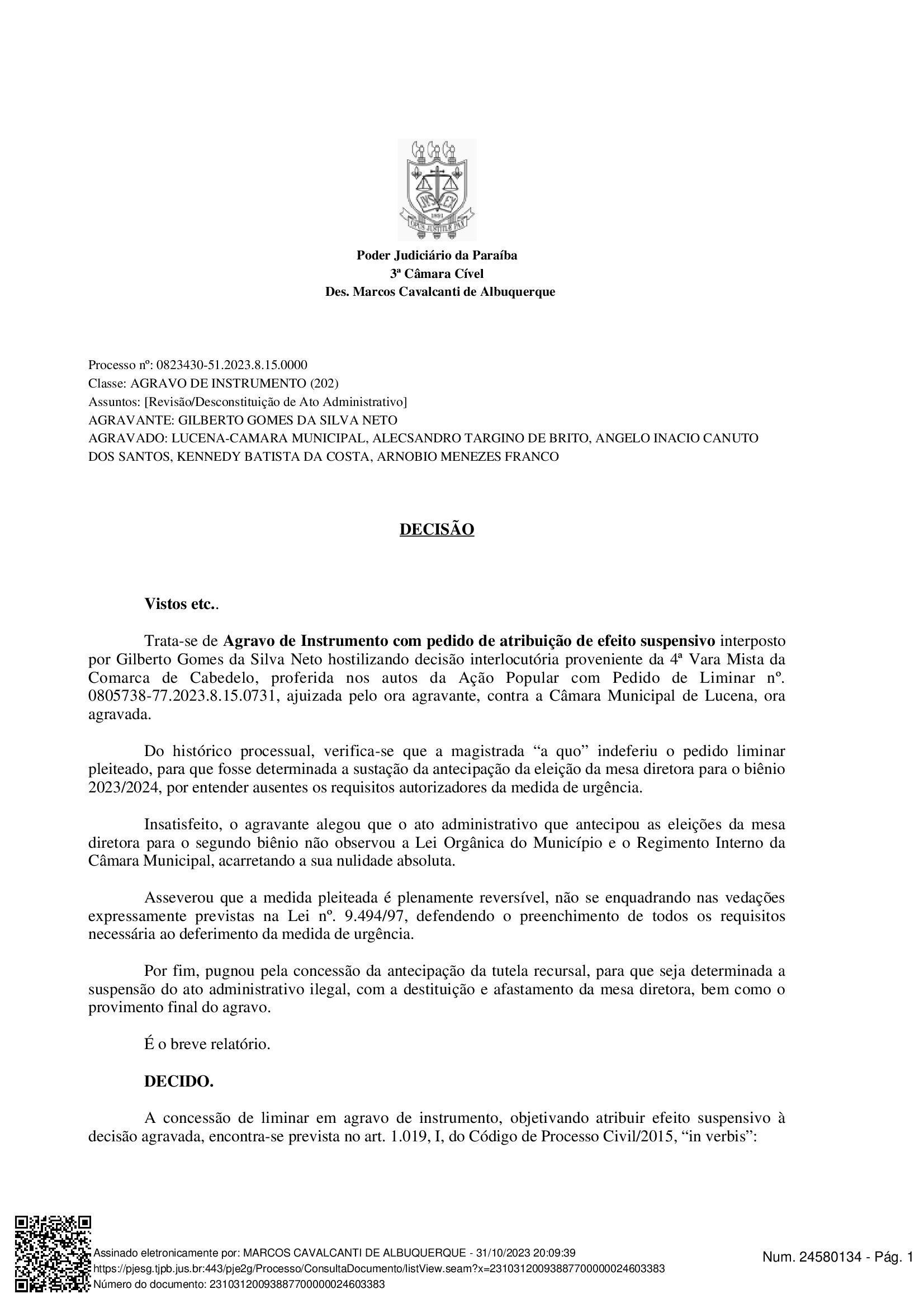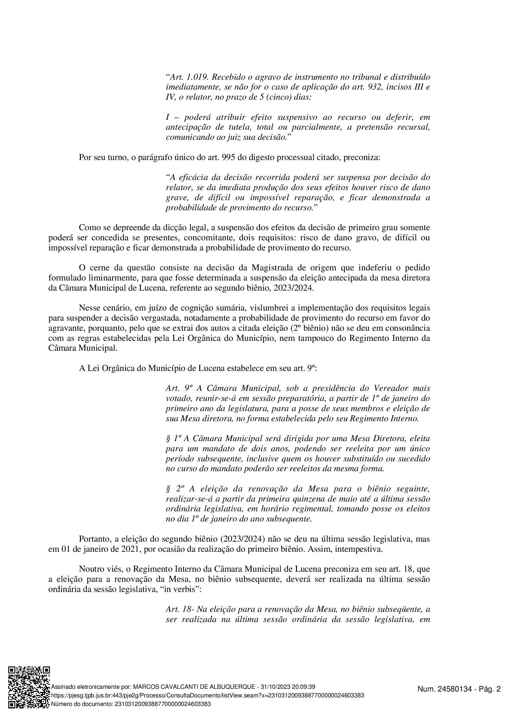 O Tribunal de Justiça da Paraíba decidiu pela suspensão da eleição da Mesa Diretora da Câmara de Vereadores de Lucena, Litoral paraibano, para o biênio 2023/2024. Com isso, a diretoria eleita para esse período está destituída. A decisão é do desembargador Marcos Cavalcanti de Albuquerque.