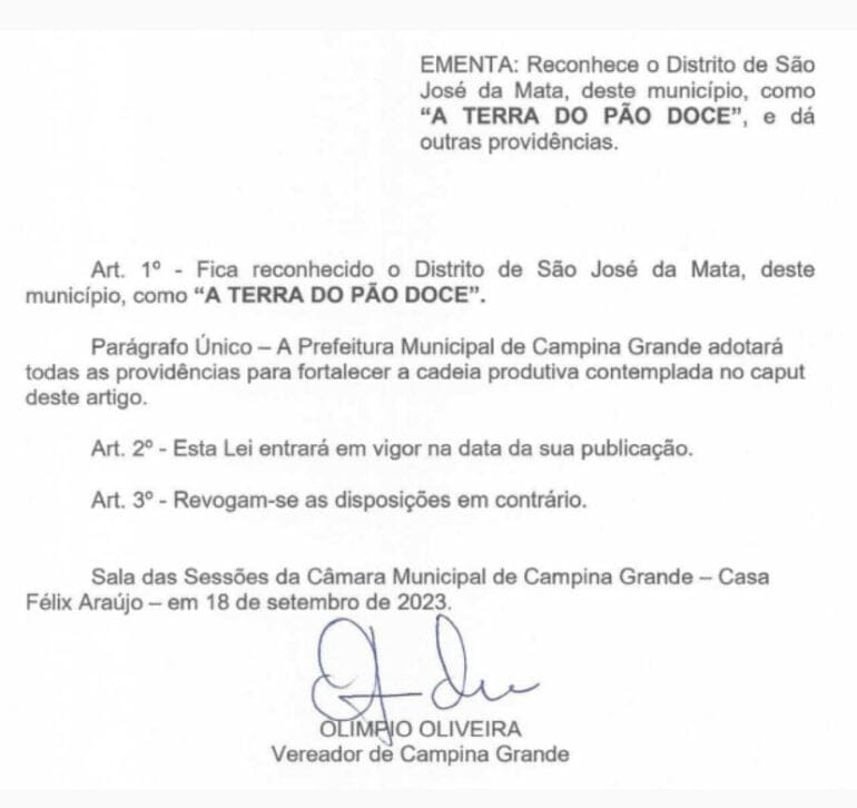 A Câmara de Vereadores de Campina Grande aprovou um projeto que reconhece o Distrito de São José da Mata, em Campina Grande, como a ‘terra do pão doce’. A ideia partiu do vereador Olímpio Oliveira. O objetivo é estimular a divulgação de uma das potencialidades do Distrito e impulsionar a economia da panificação; e também o turismo.