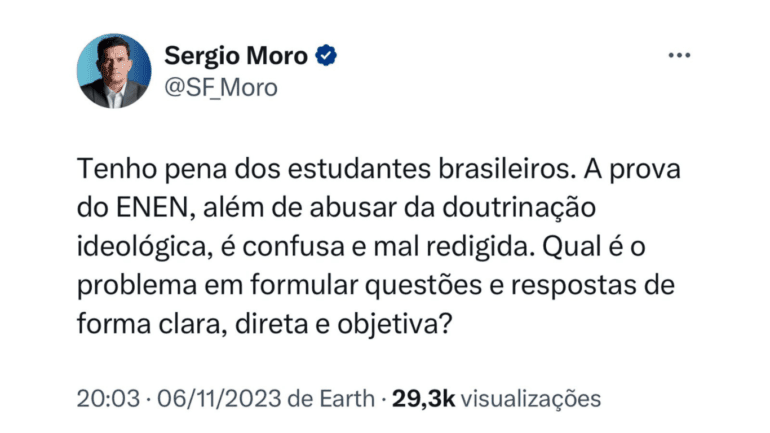 Ao criticar o Exame Nacional do Ensino Médio (Enem), aplicado no domingo (5), o senador Sergio Moro (União-PR) escreveu incorretamente o nome do exame, que é aplicado anualmente desde 1998, chamando-o de “prova do ENEN”. O post foi feito nas redes sociais do senador na segunda-feira (6).