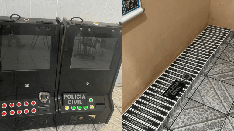 A Polícia Civil da Paraíba apreendeu nesta quarta-feira (22) mais de 50 maços de cigarros contrabandeados e duas máquinas caça-níqueis no município de Pocinhos, Agreste da Paraíba. As apreensões foram realizadas durante cumprimento de mandado de busca e apreensão domiciliar.