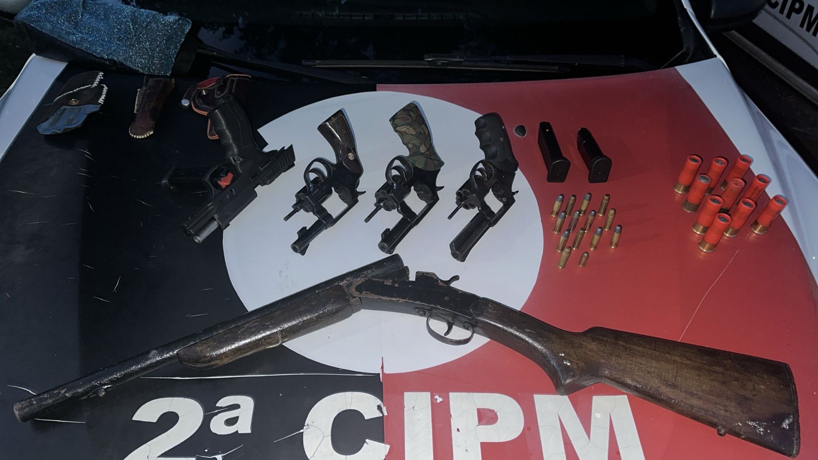 Durante a operação foram apreendidas uma pistola, três revólveres, além de munições, artefatos explosivos feitos de forma caseira, droga e aparelhos celulares.