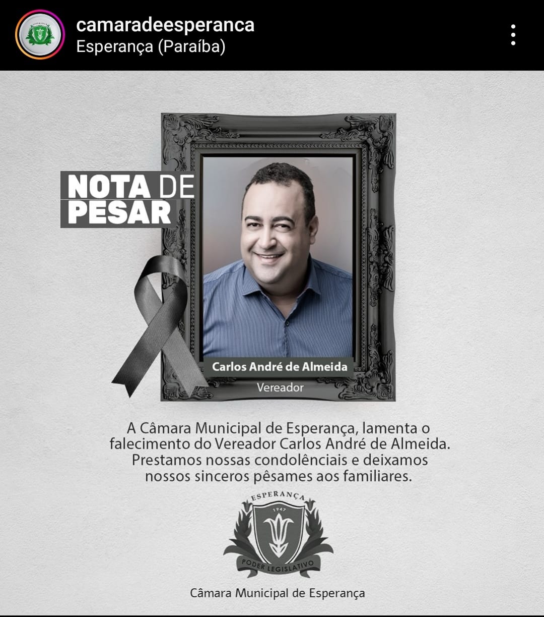 Por meio de uma nota de pesar publicada nesta segunda-feira (25), a Câmara Municipal de Esperança lamentou a morte do vereador Carlos André Almeida. A morte do parlamentar foi confirmada na madrugada de hoje.