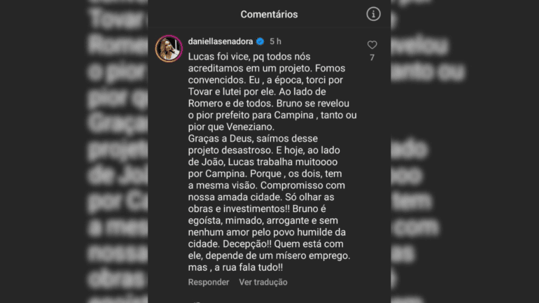 No vídeo o ex-senador lembrou dos ex-prefeitos campinenses e citou o pai de Daniella, Enivaldo Ribeiro. Ao comentar a declaração, a senadora voltou a criticar a gestão Bruno Cunha Lima (União Brasil).