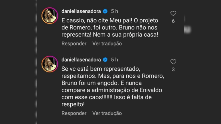 “E Cássio, não cite meu pai! O projeto de Romero, foi outro. Bruno não nos representa! Nem a sua própria casa! Se você está bem representado, respeitamos. Mas, para nós e Romero, Bruno foi um engodo. E nunca compare a administração de Enivaldo com esse caos. Isso é falta de respeito”, diz post da senadora nas redes sociais.