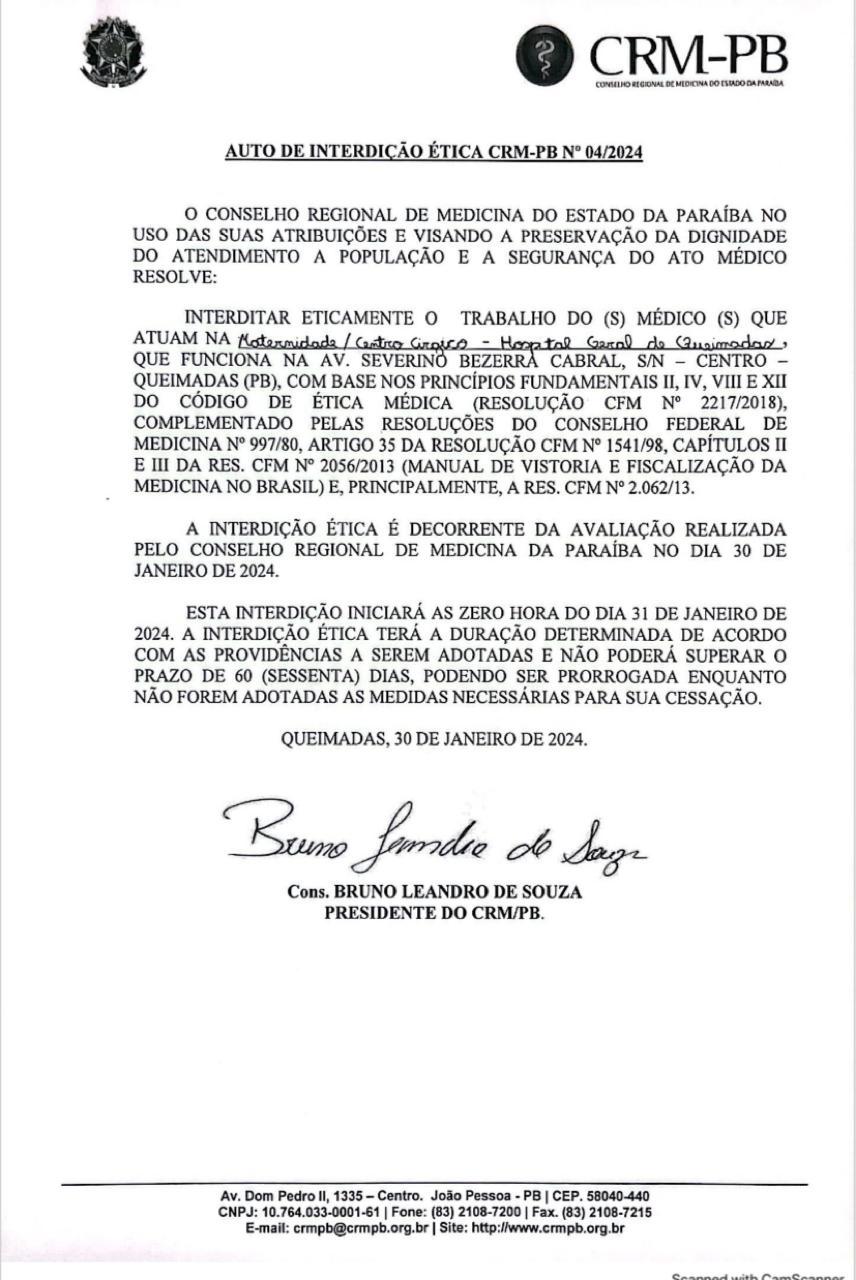 Na tarde desta terça-feira (30), o Conselho Regional de Medicina da Paraíba (CRM-PB) tomou a decisão de interditar eticamente a Maternidade e o Centro Cirúrgico do Hospital Geral de Queimadas.