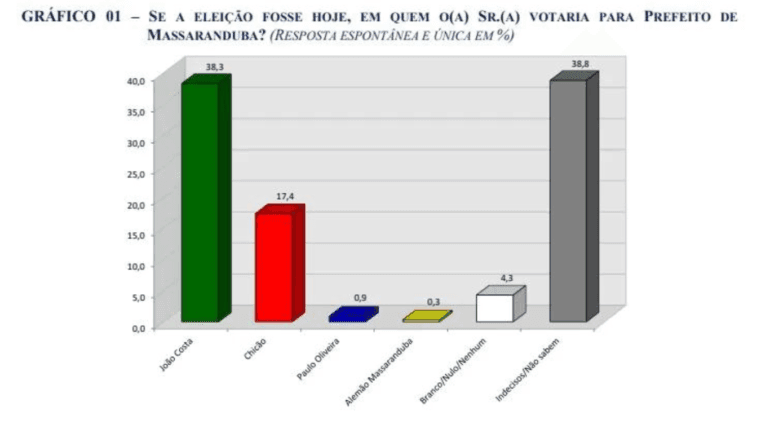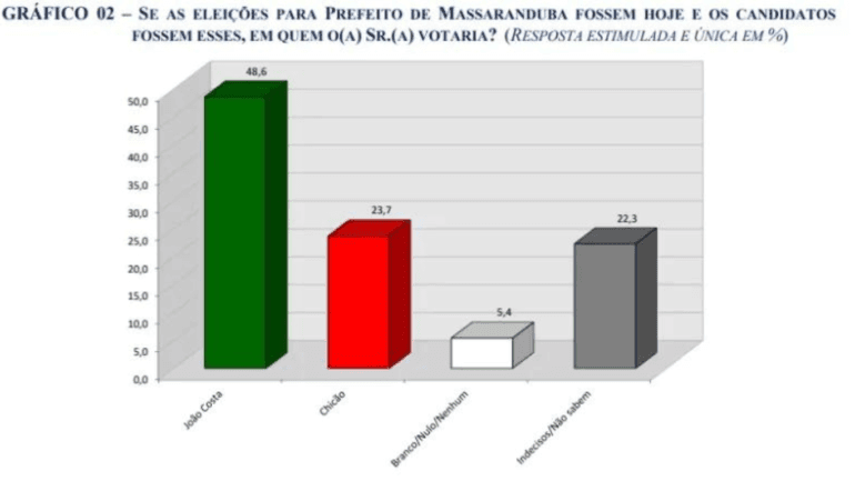 Se fossem hoje as eleições suplementares para prefeito de Massaranduba, município localizado na região de Campina Grande, o empresário João Costa (União) venceria o pleito com 48,6% dos votos contra 23,7% de Francisco Pedro, conhecido por Chicão (PSD), gestor em exercício do município. Os dados são de pesquisa estimulada realizada pelo Instituto Opinião, contratada pelo Portal MaisPB e divulgada nesta segunda-feira (5).