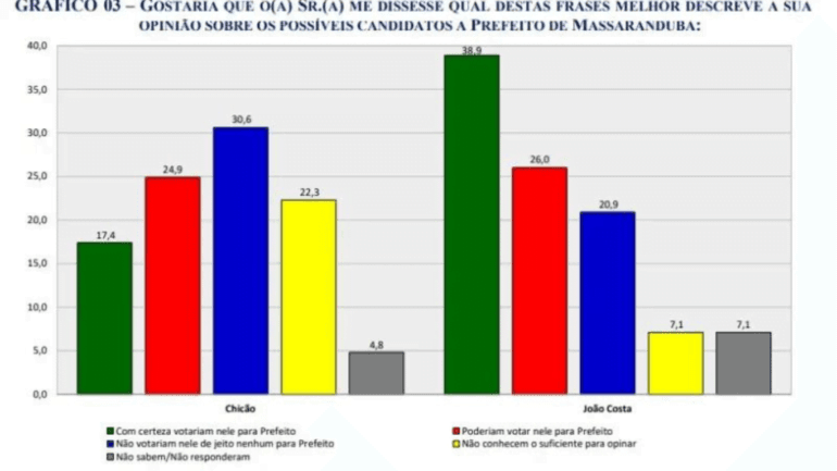 Para a mesma pergunta, 17,4% disseram que votarão com certeza em Chicão para prefeito de Massaranduba, 24,9% responderam que poderão votar, 30,6% asseguram que não votam nele de jeito nenhum, 22,3% consideram não conhecer o candidato suficientemente e 4,8% não sabem ou não responderam.