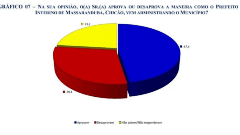 A gestão de Chicão, prefeito interino de Massaranduba, é aprovada por 47,4% dos eleitores do município. Outros 29,4% dos entrevistados reprovam a forma como a cidade está cedo administrada e 23,2% não souberam ou não quiseram responder a avaliação.