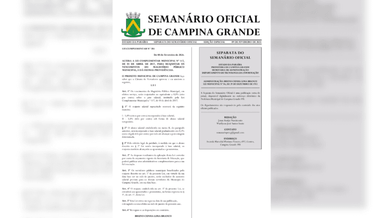 Foi sancionada a Lei Complementar nº 201, de 8 de fevereiro de 2024, que garante o reajuste dos professores municipais de Campina Grande, no Agreste da Paraíba. De acordo com a lei, publicada em separata do Semanário Oficial (edição especial) de 9 de fevereiro, os vencimentos do magistério, em efetivo serviço, serão reajustados no equivalente a 8% sobre o piso salarial da categoria.