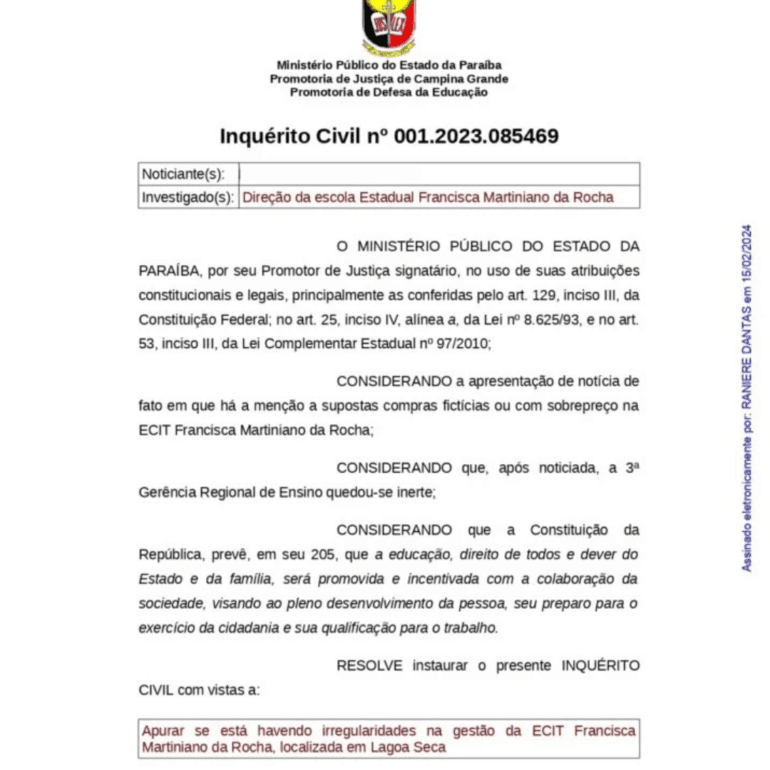 O Ministério Público da Paraíba (MPPB) instaurou um inquérito para apurar supostos desvios de verbas na Escola Estadual ECIT Francisca Martiniano da Rocha, em Lagoa Seca, no Agreste paraibano. A investigação tem por objetivo apurar possíveis compras fictícias ou com sobrepreço.