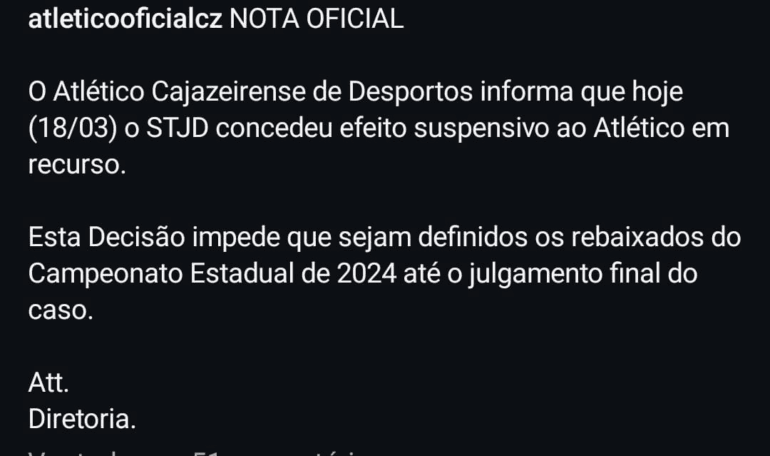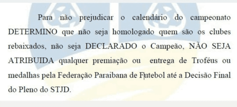 Nesta segunda-feira (18), o Supremo Tribunal de Justiça Desportiva (STJD) concedeu um efeito suspeito ao Atlético-PB que determina a anulação da punição imposta pelo Tribunal de Justiça Desportiva de Futebol da Paraíba (TJDF-PB).