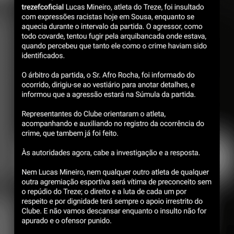 O Treze emitiu uma nota em suas redes sociais, neste domingo (31), denunciando que o atleta Lucas Mineiro, que defende as cores do Galo da Borborema, teria sido alvo de expressões racistas enquanto se aquecia durante o intervalo da partida disputada entre o time de Campina Grande e o Sousa, no estádio Marizão.