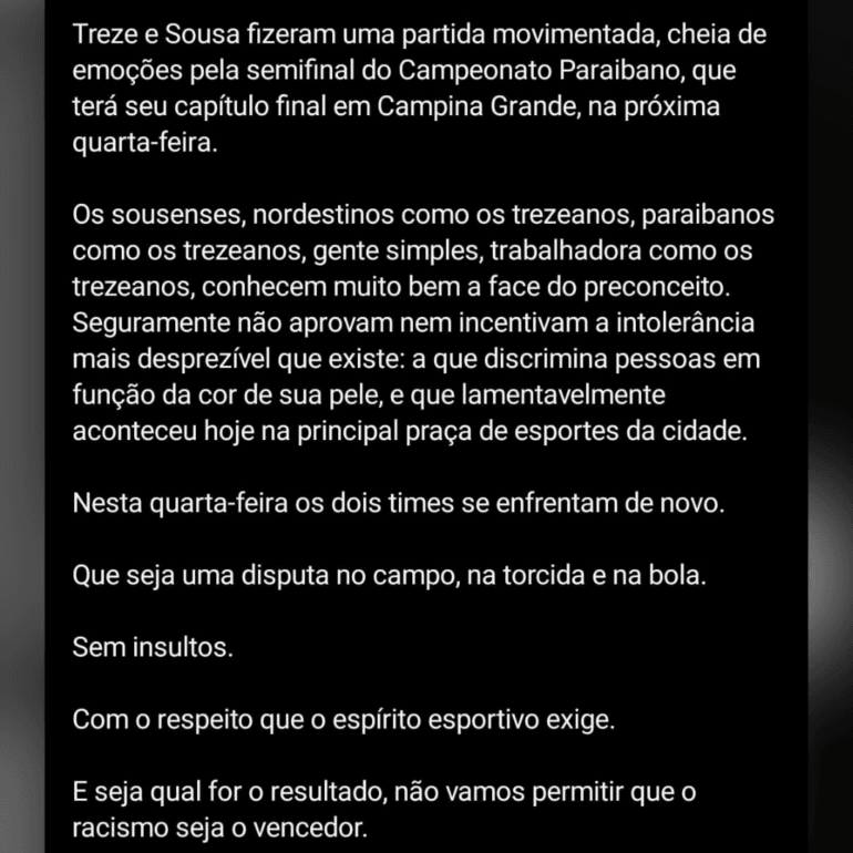 O Sousa e a Federação Paraibana de Futebol (FPF) também emitiram notas oficiais sobre o caso. O Dino informou que estará agindo em apoio as autoridades para que o caso seja elucidado e ressaltou que não compactua com atos racistas. Confira a nota completa que foi publicada pela equipe sousense: