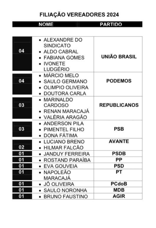 Os partidos que compõe a casa são o União Brasil com 4 vereadores, seguido pelo Podemos, também com 4 representantes, o Republicanos e PSB contém cada um três vereadores, e o Avante tem 2 nomes confirmados.