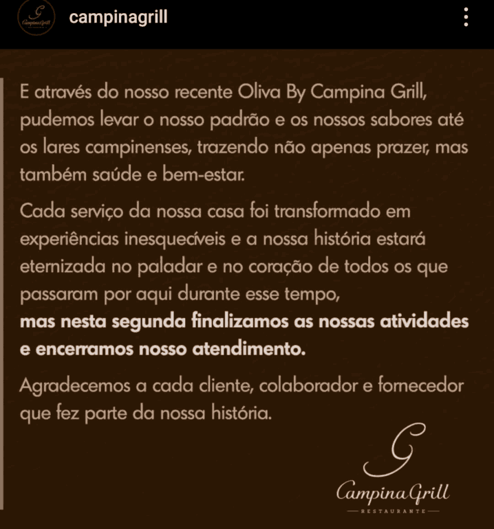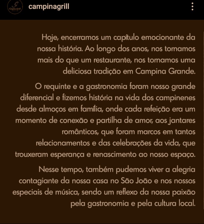 Por meio de uma nota divulgada nesta segunda-feira (15), o restaurante Campina Grill anunciou que vai estar encerrando as atividades em Campina Grande, no Agreste paraibano. O estabelecimento funcionava na Avenida Manoel Tavares.