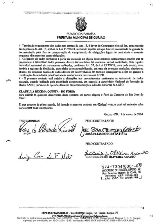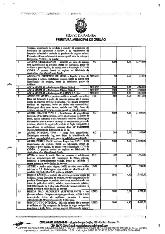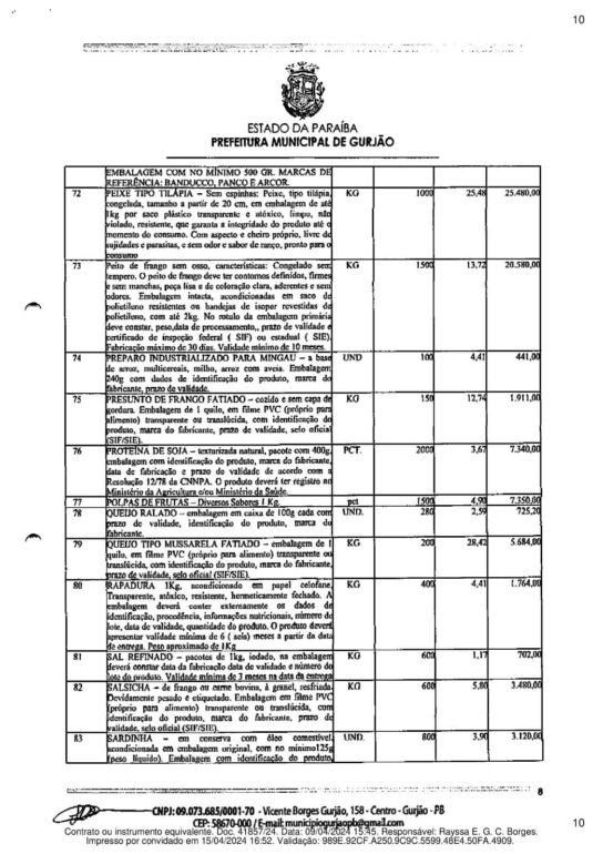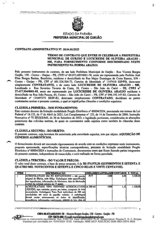 A Prefeitura de Gurjão contratou o fornecimento de mais de meio milhão de reais em alimentos diversos. A lista inclui bolos, biscoitos salgados e doces, além de caixas de chocolate, bombons Sonho de Valsa, Serenata de Amor e Ouro Branco.