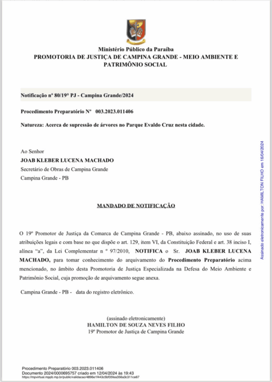 A notificação, arquivando a ação, foi assinada pelo 19º promotor de Justiça da cidade, Hamilton de Souza Neves Filho, e enviada ao secretário municipal de Obras, Joab Machado.