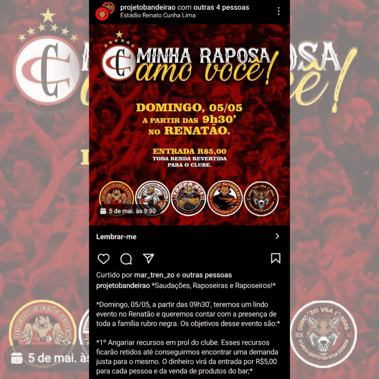 Integrantes de quatro torcidas informaram ao blog que pretendiam realizar um evento no próximo domingo (05), nas dependências do estádio Renatão, com o objetivo de arrecadar fundos para ajudar financeiramente a Raposa.