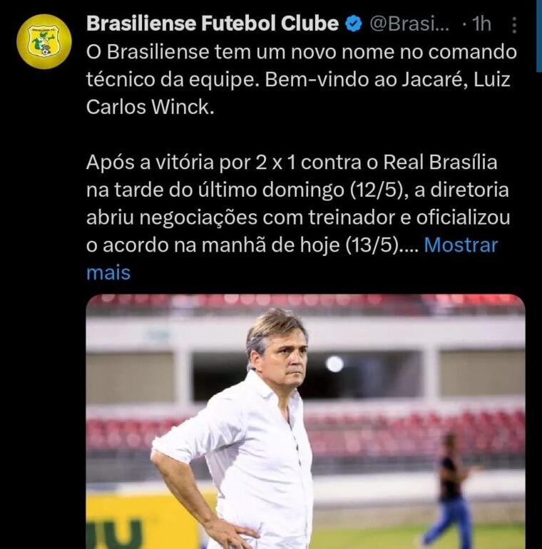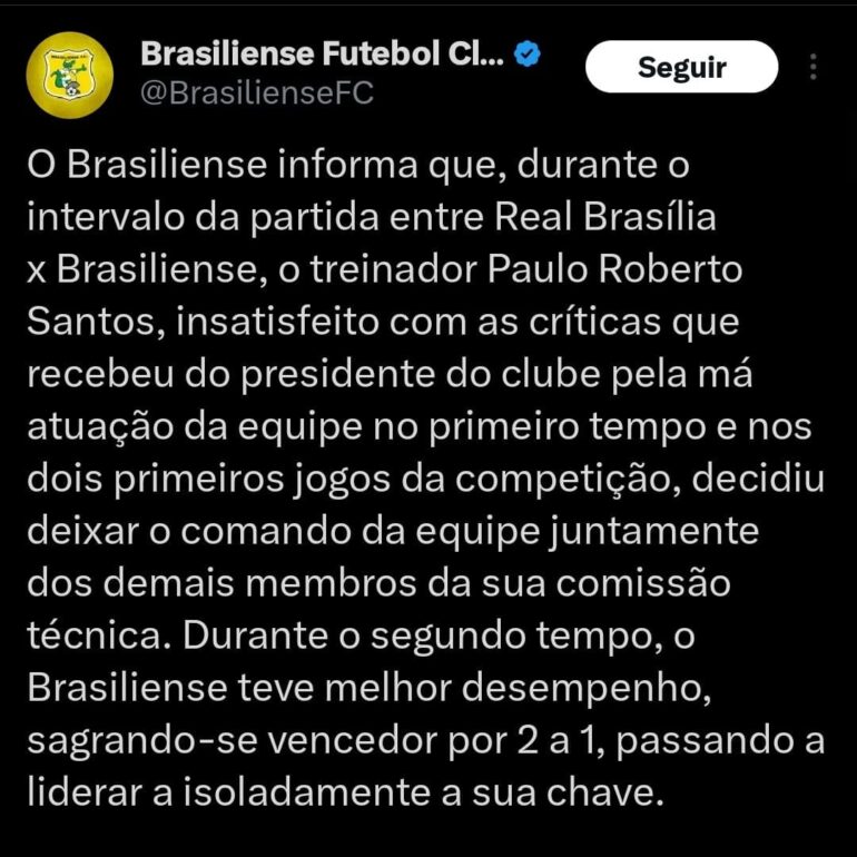 Para surpresa dos torcedores presentes no Estádio Ciro Machado do Espírito Santo, o treinador Paulo Roberto Santos não retornou à beira do campo para comandar o Brasiliense no segundo tempo do jogo com o Real Brasília, pela Série D do Campeonato Brasileiro. De acordo com pronunciamento do clube, o técnico não gostou das críticas que ouviu do presidente, Luiz Estevão, durante a parada e optou por deixar o comando da equipe ainda no intervalo. Então, o médico do time, Jorge Oliva, assumiu a posição de liderança à beira do gramado e levou a equipe à vitória no segundo tempo. A equipe do Distrito Federal anunciou hoje (13) que o novo comandante do time será Luiz Carlos Winck.