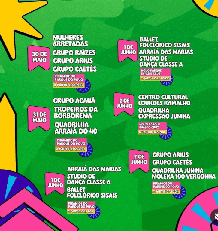 A Secretaria de Cultura de Campina Grande/PB divulgou a programação das quadrilhas e dos grupos folclóricos que estarão se apresentando no Maior São João do Mundo deste ano.