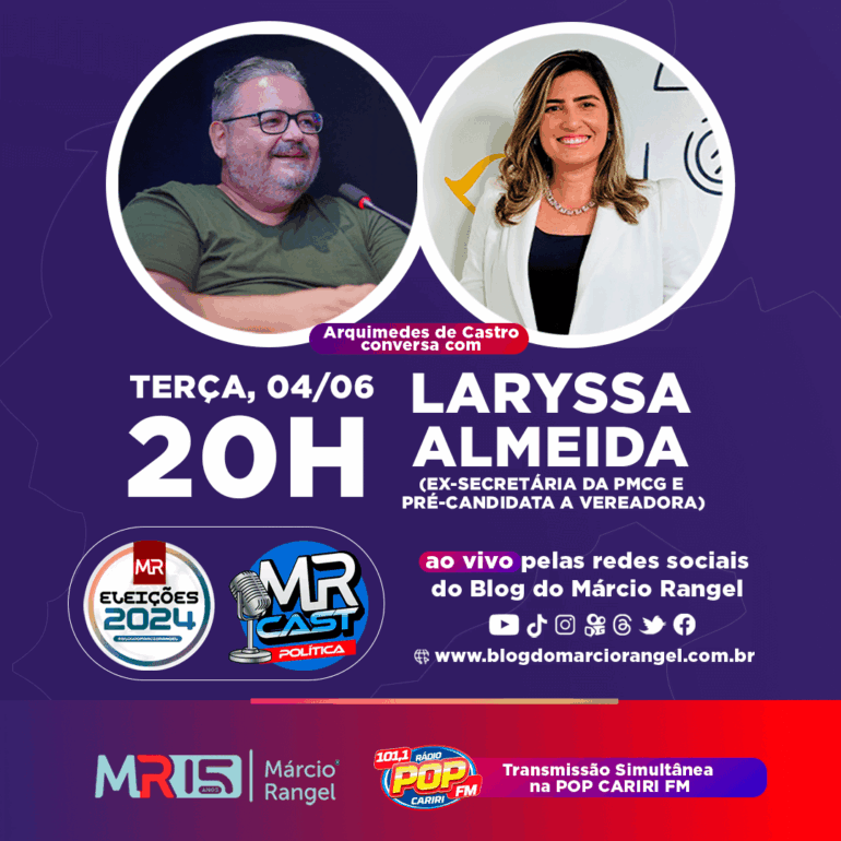 A ex-secretária de Desenvolvimento Econômico e pré-candidata a vereadora, Laryssa Almeida, será a entrevistada do #MRCast Política desta terça-feira (04). A entrevista vai ao ar ao vivo pelas redes sociais no Blog do Márcio Rangel e com transmissão simultânea pela Rádio Pop Cariri FM 101,1, com apresentação do jornalista Arquimedes de Castro.