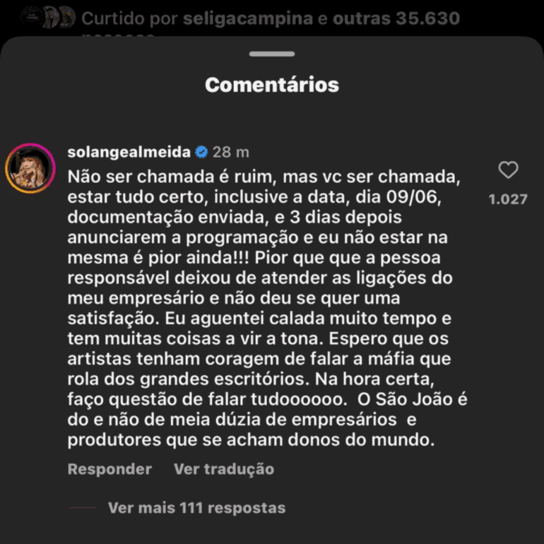 Em um comentário nas redes sociais, Solange detalhou a situação e prometeu denunciar a chamada “máfia”, de acordo com ela, do São João.