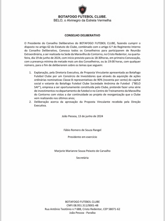 O Botafogo-PB confirmou, nesta quinta-feira (13), que recebeu uma proposta oficial para se tornar uma Sociedade Anônima de Futebol (SAF). O clube ainda não revelou os valores oficiais da proposta, mas o Conselho Deliberativo do Belo já convocou uma Assembleia Geral para discutir a pauta na próxima quarta-feira (19). O clube pessoense também não divulgou quem são os investidores.