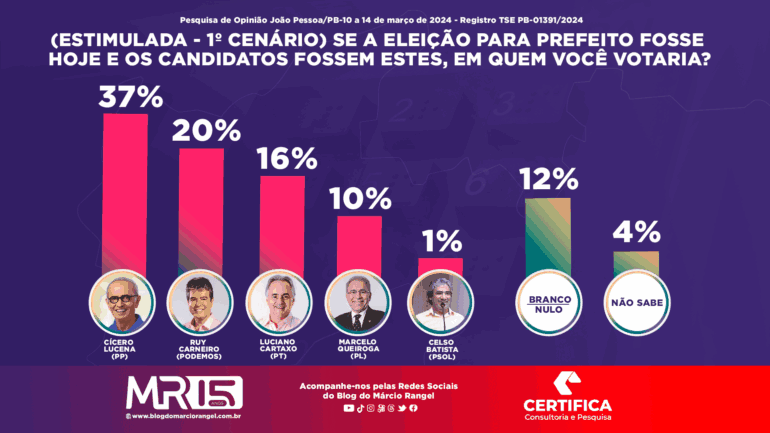 De acordo com os dados da consulta na modalidade estimulada – quando são apresentados, ao entrevistado, opções de pré-candidatos, – o atual prefeito e pré-candidato a reeleição, Cícero Lucena (PP), lidera com 37% das intenções de voto. Em segundo lugar, o deputado federal Ruy Carneiro (Podemos) aparece com 20% na preferência do eleitor.