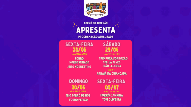 A Vila do Artesão, em Campina Grande, divulgou a programação da última semana do Maior São João do Mundo, que tem atraído milhares de turistas. As festividades juninas no local, parte essencial das comemorações de São João em Campina Grande, se encerram na próxima sexta-feira, dia 5 de julho.