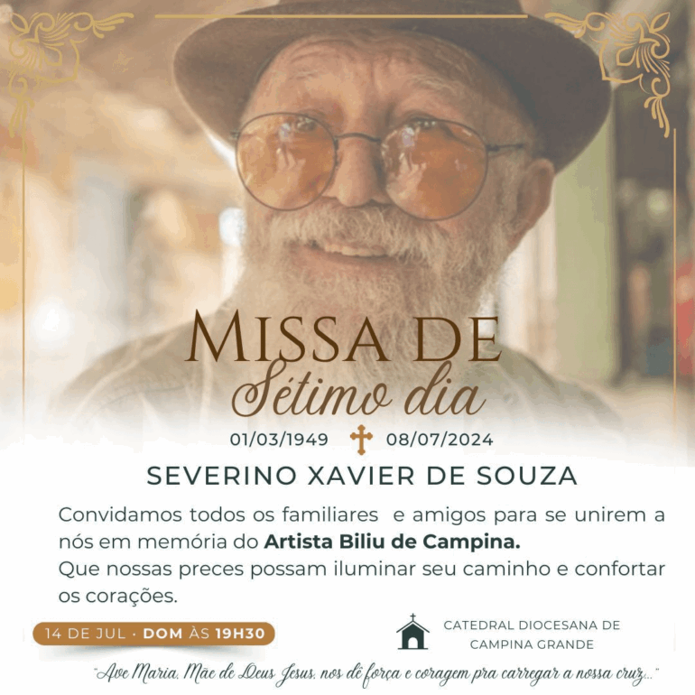 A missa de 7º dia da morte do cantor e compositor Biliu de Campina será realizada às 19h30 deste domingo (14), na Catedral Diocesana de Campina Grande/PB.