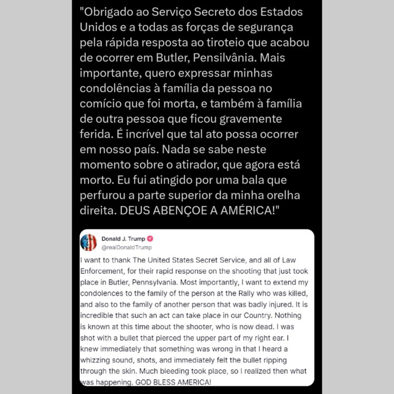 - 18h42: Oserviço secreto emite um comunicado, confirmando que Trump está seguro e que há uma investigação ativa sobre o incidente;