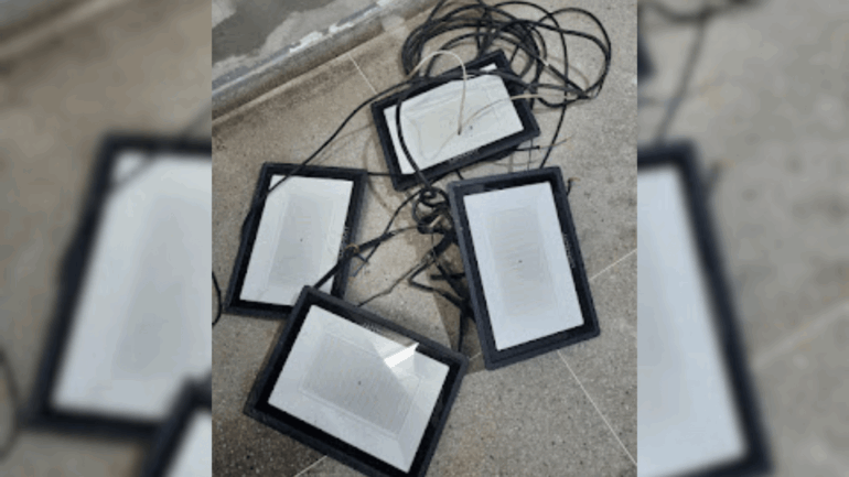 Ao avistar os policiais, o acusado tentou se esconder. Depois de algum tempo, o suspeito se entregou à polícia. Com ele os policiais encontraram quatro refletores e parte da fiação.