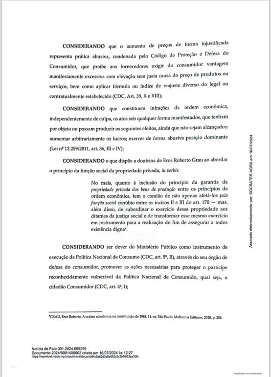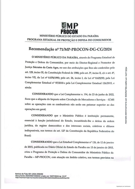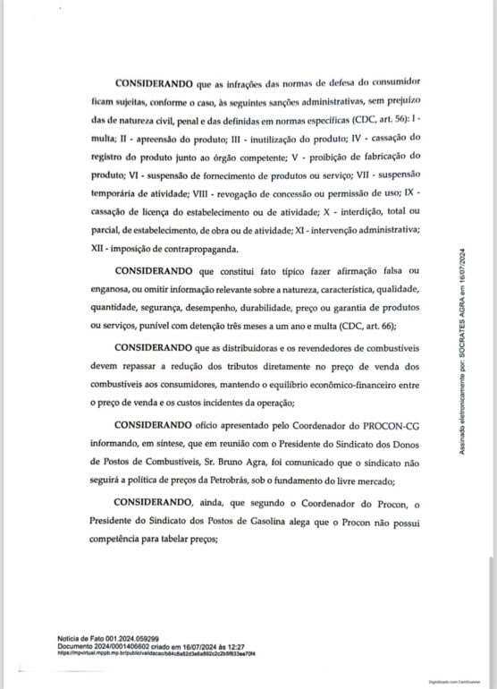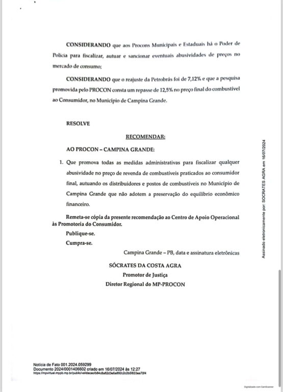 No documento, assinado pelo promotor de Justiça e diretor regional do MP-Procon, Sócrates da Costa Agra, o MPPB destaca que aos Procons Municipais e Estaduais é atribuído o poder de polícia para fiscalizar, autuar e sancionar eventuais abusividades de preços no mercado de consumo e aponta que o aumento praticado pelos donos de postos de combustíveis em Campina Grande fere a Política Nacional de Consumo.
