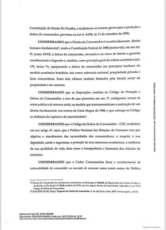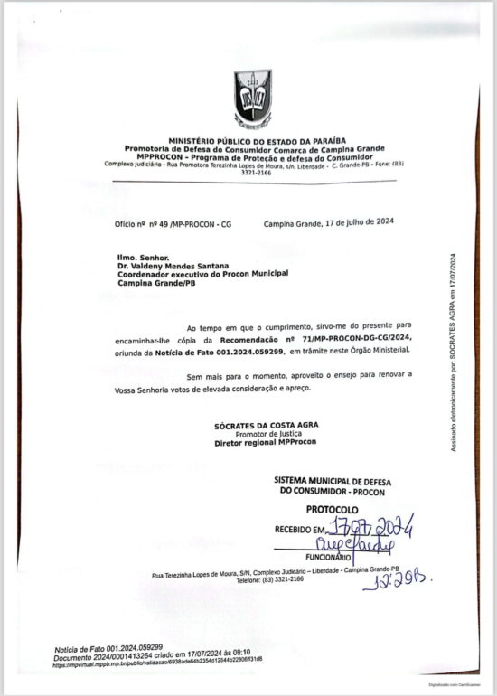 Além disso, o promotor Sócrates da Costa Agra, ressalta na recomendação, que é dever do Ministério Público, como instrumento de execução da Política Nacional de Consumo (CDC, Art. 5ª , II), através do seu órgão de defesa do consumidor, promover as ações necessárias para proteger o partícipe reconhecidamente vulnerável da Política Nacional de Consumo, qual seja, o cidadão consumidor (CDC, art 4a, I), a exemplo do trabalho que deve ser realizado em Campina Grande para reestabelecer a harmonia das boas relações consumeristas no município.