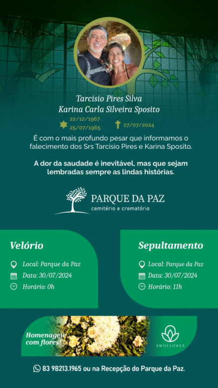 O velório e o sepultamento de Tarcisio Pires da Silva e Karina Carla Silveira Sposito serão no Parque da Paz, em Campina Grande/PB. O velório começará a partir das 00h desta terça-feira (30) enquanto o sepultamento será realizado às 11h do mesmo dia. O casal morreu no incêndio dentro de um apartamento em Fortaleza/CE, neste sábado (27).