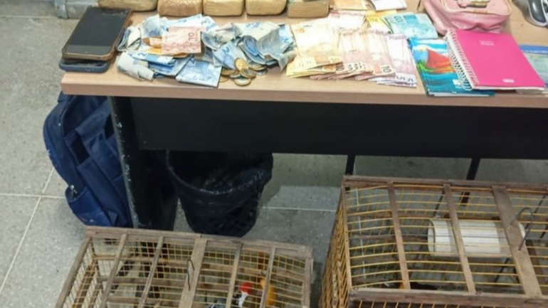 Já na casa do casal que entregou a droga, foram encontrados pássaros em gaiolas, uma balança de precisão, duas cadernetas, duas folhas de cadernos contendo informações sobre a contabilidade do tráfico e um celular, além de uma quantia em dinheiro.