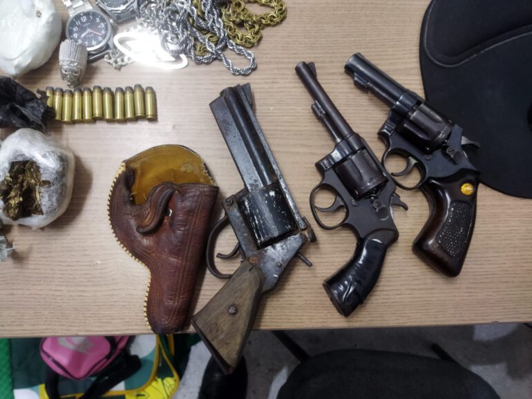 No total, foram apreendidos dois revólveres calibre 32 e um de fabricação artesanal calibre .38, onze munições de calibre 32, cinco celulares, dois relógios, três correntes, um anel, um bloqueador de sinais, cocaína, maconha, crack, material de embalo e corte para drogas e um pneu de estepe.