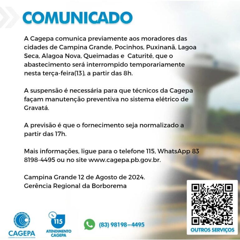 A Companhia de Água e Esgotos da Paraíba (Cagepa) anunciou que terá que interromper, temporariamente, o abastecimento de água em alguns bairros de Campina Grande e também nas cidades de Puxinanã, Pocinhos, Lagoa Seca, Alagoa Nova, Queimadas e Caturité. O fornecimento será interrompido a partir das 8h desta sexta-feira (09) e deverá ser retomado a partir das 17h.