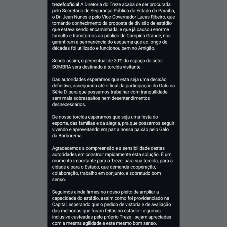 Confira os dois comunicados publicados nas redes sociais do Galo da Borborema: