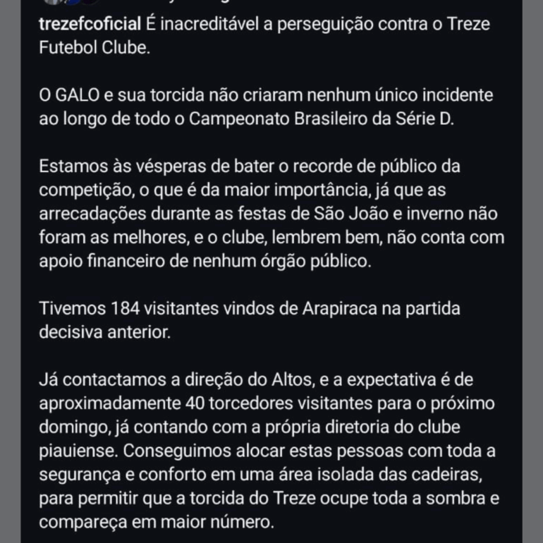 O Galo da Borborema discordou da decisão e emitiu uma nota argumentando que os 40 torcedores visitantes deveriam ocupar 20% do espaço do setor sombra. Após emitir o comunicado, a diretoria da equipe trezeana informou que foi procurada por Jean Nunes, secretário de Segurança Pública do Estado da Paraíba, e por Lucas Ribeiro, vice-governador do Estado, que tomaram conhecimento da situação e garantiram que a torcida do Altos-PI ficará na localidade que corresponde a 20% do setor sombra, proposta essa que já havia sido defendida pelo Treze anteriormente.