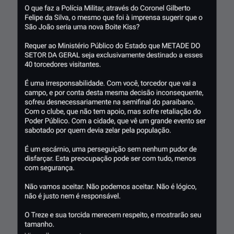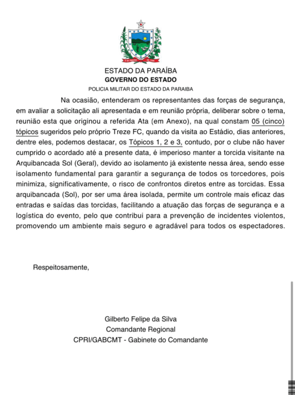 A Polícia Militar da Paraíba e o Treze entraram em divergência com relação a alocação da torcida visitante para o jogo contra o Altos-PI no Estádio ‘O Amigão’. A partida de volta das oitavas da Série D acontecerá no próximo domingo (18) e o time mandante venceu o confronto de ida por 1×0.