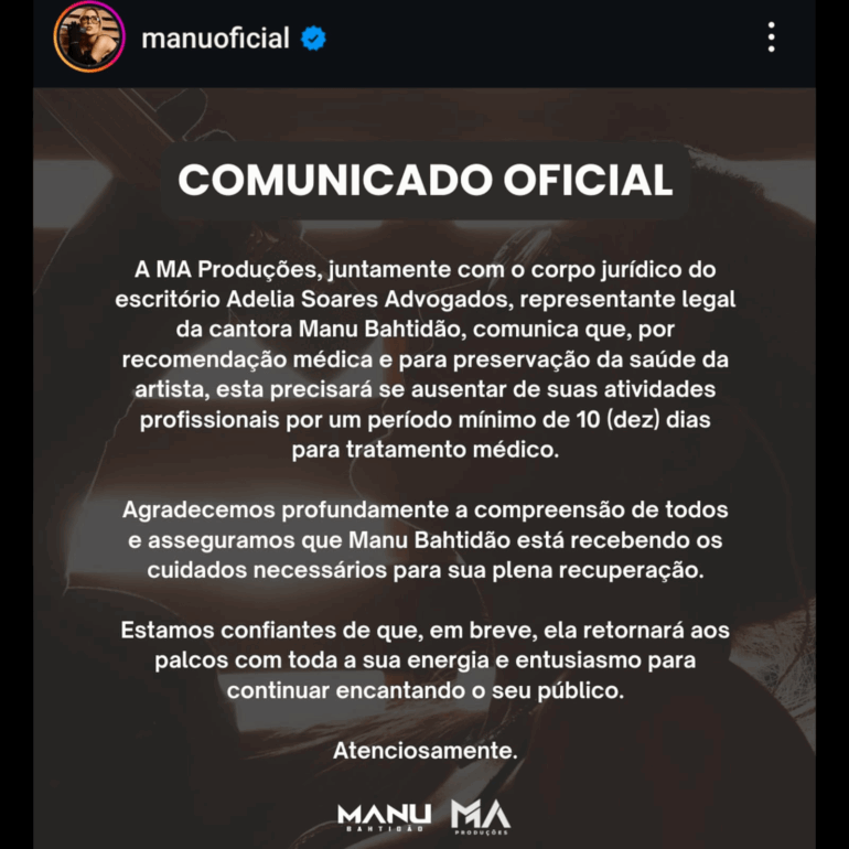 “A MA Produções, juntamente com o corpo jurídico do escritório Adelia Soares Advogados, representante legal da cantora Manu Bahtidão, comunica que, por recomendação médica e para preservação da saúde da artista, esta precisará se ausentar de suas atividades profissionais por um período mínimo de 10 dias para tratamento médico”, contou o início da nota.