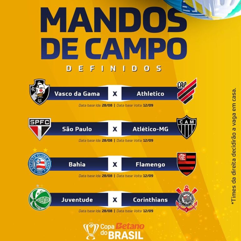 Oito times permanecem na disputa pelo título da Copa do Brasil. São eles: Athletico-PR, Atlético-MG, Bahia, Corinthians, Flamengo, Juventude, São Paulo e Vasco.