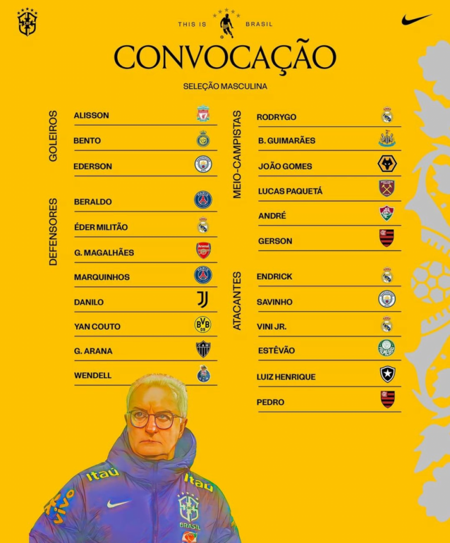 Ao todo, seis jogadores da convocação que atuam no Brasil. Além de Estevão, Luiz Henrique, André (Fluminense), Gerson e Pedro (ambos do Flamengo), o lateral Guilherme Arana (Atlético-MG), que esteve na Copa América, foi lembrado novamente por Dorival. O treinador lamentou, porém, ter ouvido de torcedores – segundo ele – para não chamar atletas de seus clubes do coração, com receio de perdê-los por lesão em jogos importantes do calendário.