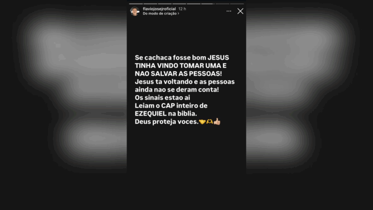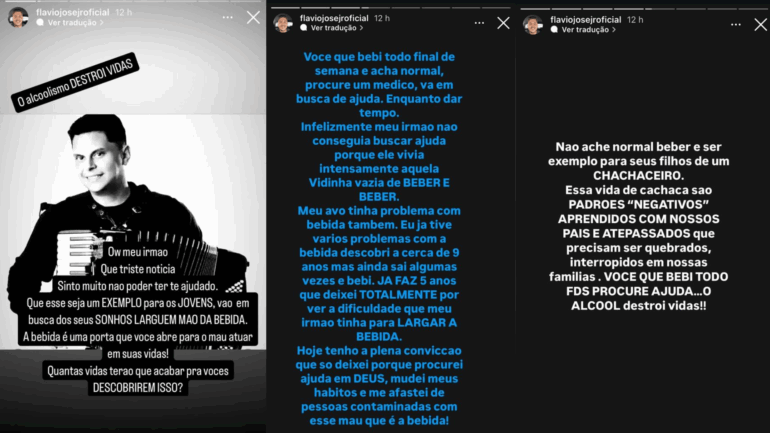 “Você que bebe todo final de semana e acha normal, procure um médico, vá em busca de ajuda. Enquanto dá tempo. Infelizmente meu irmão não conseguia buscar ajuda porque ele vivia intensamente aquela vidinha vazia de BEBER E BEBER. Meu avô tinha problema com bebida também. Eu já tive vários problemas com a bebida, descobri a cerca de 9 anos mas ainda saí algumas vezes e bebi”, escreveu Flávio José Júnior em um post nas redes sociais.