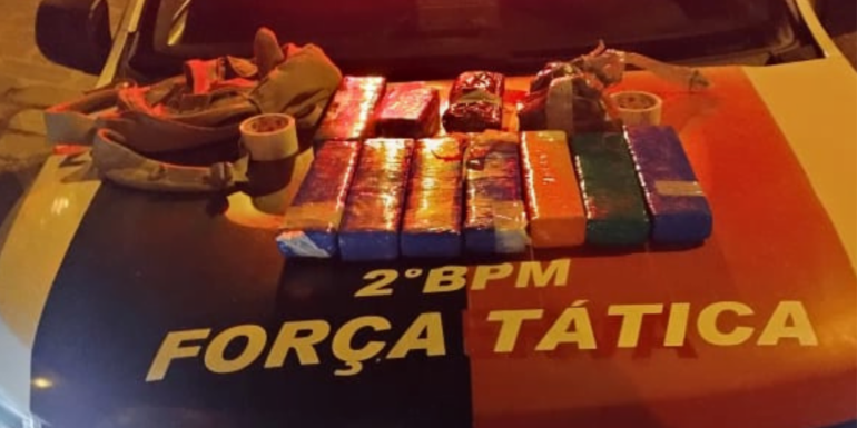 Em determinado momento, o suspeito que estava na garupa da motocicleta perdeu o equilíbrio e deixou cair uma mochila, onde os policiais encontraram 13 tabletes do entorpecente (maconha) e ainda uma sacola contendo invólucros com drogas prontas para o consumo, totalizando aproximadamente 10kg de drogas.