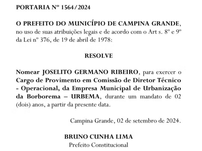 O ex-vereador Joselito Germano, conhecido como ‘o Joia’, foi nomeado hoje como diretor técnico da Empresa Municipal de Urbanização da Borborema (Urbema). Inicialmente, ele iria disputar as eleições deste ano pelo Rede Sustentabilidade, partido de oposição no município, mas teve o registro de candidatura indeferido pela Justiça Eleitoral
