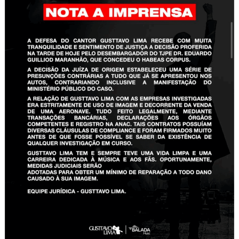 “A relação de Gusttavo Lima com as empresas investigadas era estritamente de uso de imagem e decorrente da venda de uma aeronave. Tudo feito legalmente, mediante transações bancárias, declarações aos órgãos competentes e registro na ANAC”, diz o texto.
