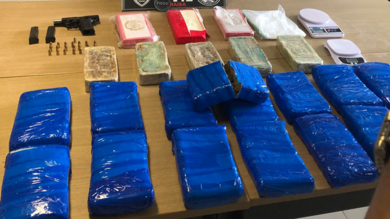 Na residência, a polícia apreendeu 5 kg de crack, 3 kg de cocaína e 15 kg de Skank, além de uma pistola calibre .380 com 2 carregadores, 22 munições, duas balanças de precisão e aparelhos celulares.