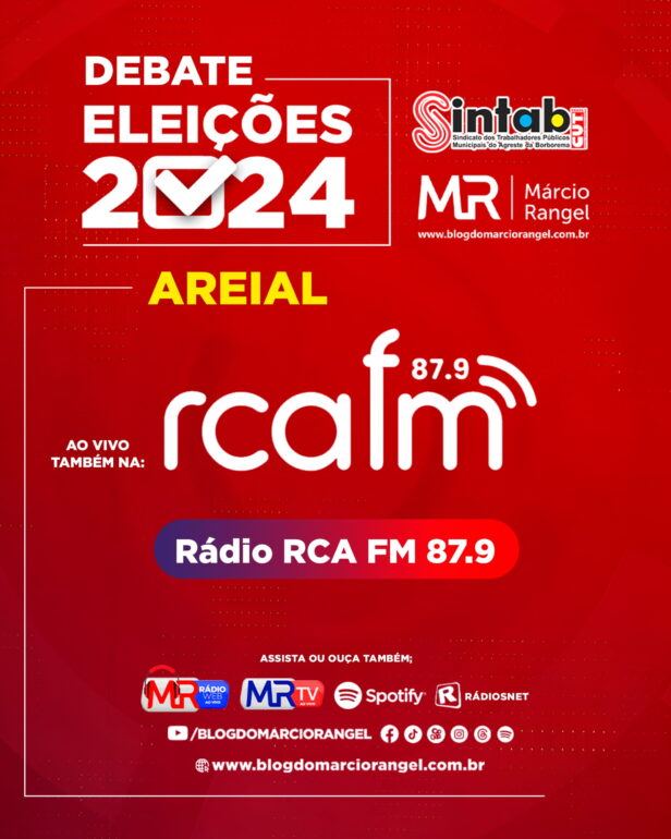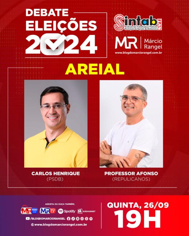 O Blog do Márcio Rangel e o Sintab realizam hoje (26), às 19h, o debate eleitoral dos candidatos a prefeito de Areial/PB. Carlos Henrique (PSDB) e Professor Afonso (Republicanos) foram convidados a participarem do embate de ideias.